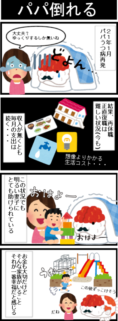 うつ症状によって、たびたび倒れてしまう私(パパ)。ほんとこの繰り返しが、悲しく、情けない気持ちになる時があります。