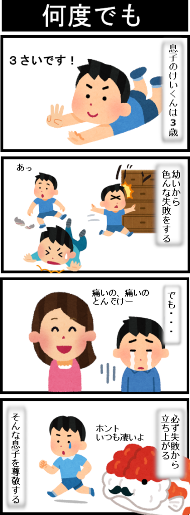 人間というものは失敗を重ねる生き物だと思っています。そして、幼い子供は色んなことが上手にできなかったりします。そんな失敗をすると泣くんですが、必ず立ち上がって成長していくんですね。そんな息子が本当にすごいなって思うんです。大人になると、色んな失敗が怖くなります。泣くことができない場面もあります。でも、息子は自分を素直に表現して、日々立ち上がって成長するんですね。