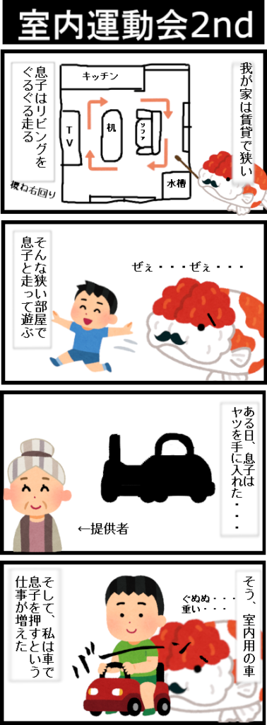 急遽、狭い賃貸の我が家で開催される、室内運動会。 息子は、とても可愛い笑顔で走るんですね。でも、一人で走るのは寂しいのか、途中から大人を巻き込み始めます。 その…