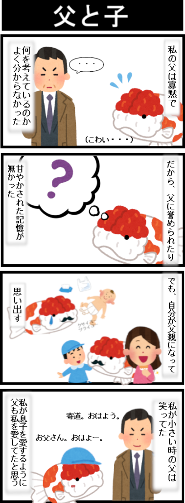 最後に、このように漫画を描くと、父は亡くなってる風ですが、元気に生きてます。